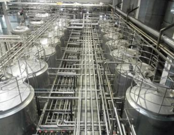 酸罐、堿罐、多個水罐以及泵和閥組等組成的清洗系統(tǒng)